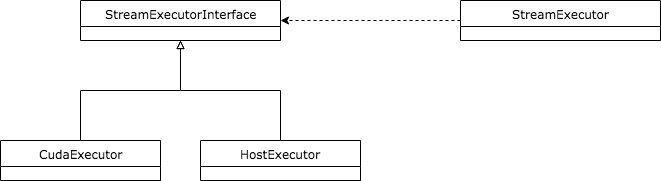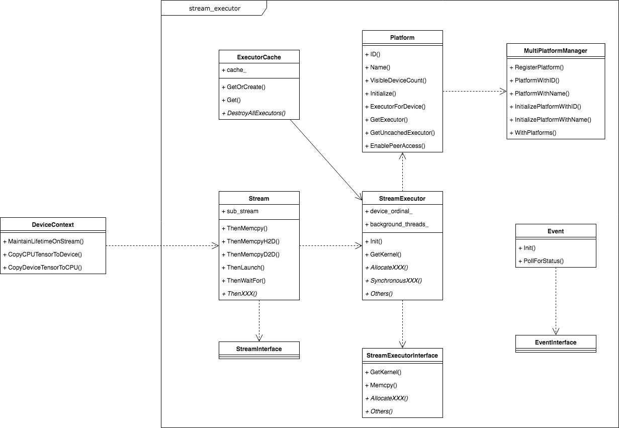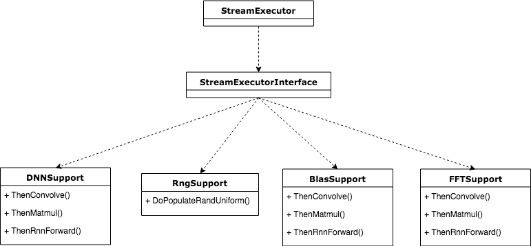 从源代码上看这一层非常复杂,因为它涉及到的类最多,但是当我们把Platform层和Library层分开看待后,这一层就变得非常简单了。对于外部使用者来说,获取Platform就是为了获取对应的执行引擎。对于TensorFlow这种存在多种Platform和执行引擎的异构框架来说,必须为每一种执行引擎提供完整的实现,这具有一定的复杂度。为了让代码结构更有层次感,也为了向Platform层隐藏底层的设计复杂度,该层选择只向上层暴露StreamExecutor类,而涉及到具体实现的StreamExecutorInterface以及各种具体的实现将由StreamExecutor类统一控制,这种代理的方式让这一层的架构更加干净,下面是涉及到这一层的类图。