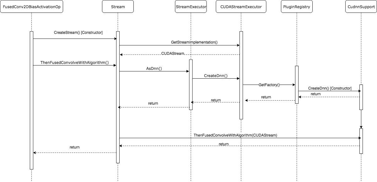 在完整的理解了StreamExecutor框架的内部结构和外部句柄后,我们就可以非常清晰地trace其调用栈了。最后,我们以调用Cudnn中的FusedConvolveWIthAlgorithm为例,画出完整的调用时序图。FusedConvolveWIthAlgorithm是将Convolution计算,Bias计算以及Activation计算fuse在一起的优化版本CUDA kernel,它的效率相对于分开调用相比更高。