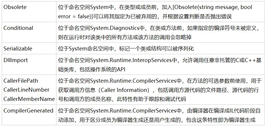 使用特性Attribute可以将描述程序集的信息和描述程序集中任何类型和成员的信息添加到程序集的元数据和IL代码中程序可以在运行时通过反射获取到这些信息