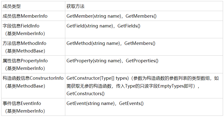 通过类型的Type对象,可以获取该类型的各种成员信息,包括: