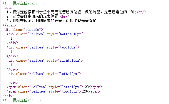 相对定位是在普通定位的基础上作出一些变动,如本来这个元素应该在第二行的位置,设置position:relative,bottom:20px;他就会在原来普通定位中应处于的位置的基础上距离底部上浮20px;