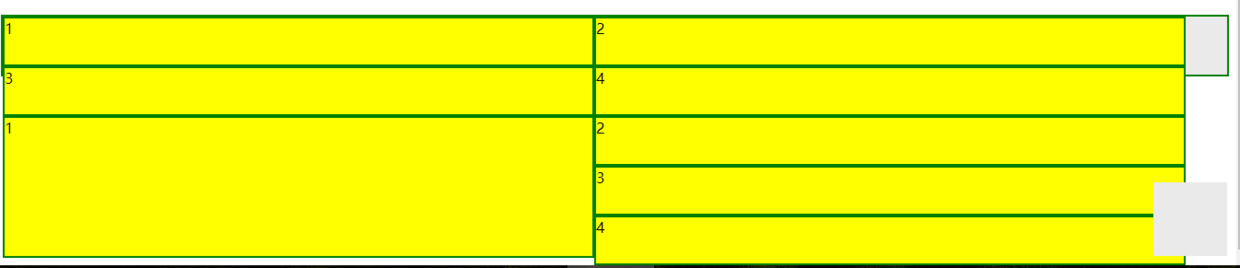 2、浮动定位会从左到右(这是左浮动,右浮动相反)依次排布,如果行宽不够则换行。换行的过程中如果左侧依然有元素占据,如下面的框1,则234会依次占据右侧空间。
