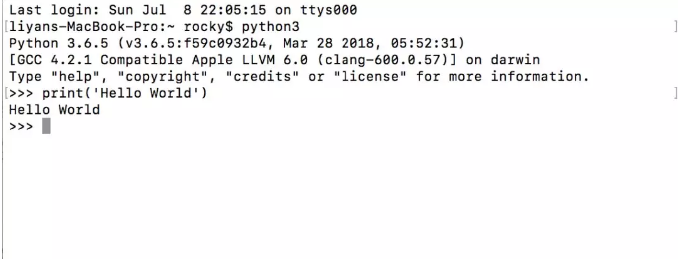 Python 安装好以后,就可以进行开发了。作为程序员,第一行代码当然是伟大的 Hello World 啦。在电脑上执行程序有两种方法,一种是在终端里输入 Python3 ,然后进入交互模式;另一种是用集成开发环境,也就是我们常说的 IDE。