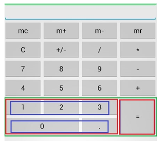 <!--绿色框--><LinearLayout android:orientation="horizontal" android:layout_width="match_parent" android:layout_height="wrap_content"> <!--红色框--> <LinearLayout android:orientation="vertical" android:layout_weight="3" android:layout_width="wrap_content" android:layout_height="wrap_content"> <!--蓝色框--> <LinearLayout android:orientation="horizontal" android:layout_width="match_parent" android:layout_height="wrap_content"> <Button android:layout_width="wrap_content" android:layout_height="wrap_content" android:layout_weight="1" android:text="1"></Button> <Button android:layout_width="wrap_content" android:layout_height="wrap_content" android:layout_weight="1" android:text="2"></Button> <Button android:layout_width="wrap_content" android:layout_height="wrap_content" android:layout_weight="1" android:text="3"></Button> </LinearLayout> <!--蓝色框 --> <LinearLayout android:orientation="horizontal" android:layout_width="match_parent" android:layout_height="wrap_content"> <Button android:layout_width="0px" android:layout_height="wrap_content" android:layout_weight="2" android:text="0"> </Button> <Button android:layout_width="0px" android:layout_height="wrap_content" android:layout_weight="1" android:text="."> </Button> </LinearLayout> </LinearLayout> <!--红色框,=号--> <LinearLayout android:orientation="vertical" android:layout_weight="1" android:layout_width="wrap_content" android:layout_height="match_parent"> <Button android:layout_width="match_parent" android:layout_height="match_parent" android:text="="> </Button> </LinearLayout></LinearLayout>