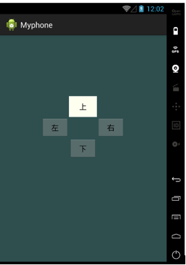 <RelativeLayout xmlns:android="http://schemas.android.com/apk/res/android" android:layout_width="match_parent" android:layout_height="match_parent" android:background="@color/darkslategray" > <Button android:id="@+id/btn1" android:layout_width="wrap_content" android:layout_height="wrap_content" android:layout_centerInParent="true" android:layout_centerHorizontal="true" android:text="下"> </Button> <Button android:id="@+id/btn2" android:layout_width="wrap_content" android:layout_height="wrap_content" android:layout_toLeftOf="@id/btn1" android:layout_above="@id/btn1" android:text="左"> </Button> <Button android:id="@+id/btn3" android:layout_width="wrap_content" android:layout_height="wrap_content" android:layout_toRightOf="@id/btn1" android:layout_above="@id/btn1" android:text="右"> </Button> <Button android:id="@+id/btn4" android:layout_width="wrap_content" android:layout_height="wrap_content" android:layout_toRightOf="@id/btn2" android:layout_above="@id/btn2" android:background="@color/white" android:text="上"> </Button></RelativeLayout>
