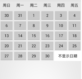<TableLayout xmlns:android="http://schemas.android.com/apk/res/android" xmlns:tools="http://schemas.android.com/tools" android:id="@+id/TableLayout2" android:layout_width="fill_parent" android:layout_height="wrap_content" > <TableRow> <Button android:layout_width="wrap_content" android:layout_height="wrap_content" android:text="周日" android:background="#00000000"/> #去除button控件的样式 <Button android:layout_width="wrap_content" android:layout_height="wrap_content" android:text="周一" android:background="#00000000"/> <Button android:layout_width="wrap_content" android:layout_height="wrap_content" android:text="周二" android:background="#00000000"/> <Button android:layout_width="wrap_content" android:layout_height="wrap_content" android:text="周三" android:background="#00000000" /> <Button android:layout_width="wrap_content" android:layout_height="wrap_content" android:text="周四" android:background="#00000000"/> <Button android:layout_width="wrap_content" android:layout_height="wrap_content" android:text="周五" android:background="#00000000" /> <Button android:layout_width="wrap_content" android:layout_height="wrap_content" android:text="周六" android:background="#00000000" /> </TableRow> <TableRow> ... ... </TableRow>... ... ... ...</TableLayout>