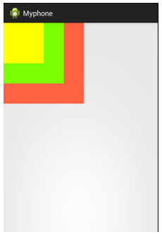 <FrameLayout xmlns:android="http://schemas.android.com/apk/res/android" xmlns:tools="http://schemas.android.com/tools" android:id="@+id/FrameLayout1" android:layout_width="match_parent" android:layout_height="match_parent" tools:context=".MainActivity" android:foregroundGravity="right|bottom"> <TextView android:layout_width="200dp" android:layout_height="200dp" android:background="#FF6143" /> //橙色 <TextView android:layout_width="150dp" android:layout_height="150dp" android:background="#7BFE00" /> //绿色 <TextView android:layout_width="100dp" android:layout_height="100dp" android:background="#FFFF00" /> //黄色</FrameLayout>