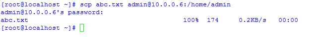 [root@localhost ~]# scp importantfile [email protected]:/home/admin/The authenticity of host '10.0.0.6 (10.0.0.6)' can't be established.RSA key fingerprint is SHA256:LqBzkeGa6K9BfWWKgcKlQoE0u+gjorX0lPLx5YftX1Y. RSA key fingerprint is MD5:ed:44:42:59:3e:dd:4c:12:43:4a:89:b1:5d:bd:9e:20.Are you sure you want to continue connecting (yes/no)? yes Warning: Permanently added '10.0.0.6' (RSA) to the list of known [email protected]'s password:importantfile 100% 0 0.0KB/s 00:00[root@localhost ~]#