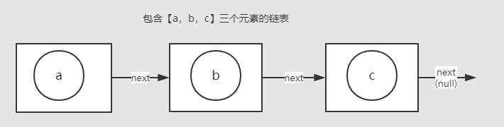 一个逻辑上存储了【a,b,c】三个元素的链表,长度为3,三个元素分别被三个节点存储。