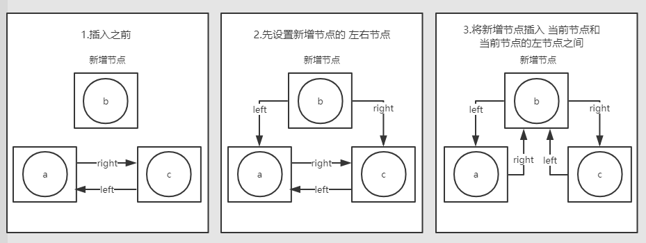 已知链表中存在【a,c】两个节点,现在c节点调用linkAsLeft方法,将b节点作为c的左节点插入链表(这时,c节点就是this)。(linkAsRight 原理类似)