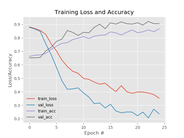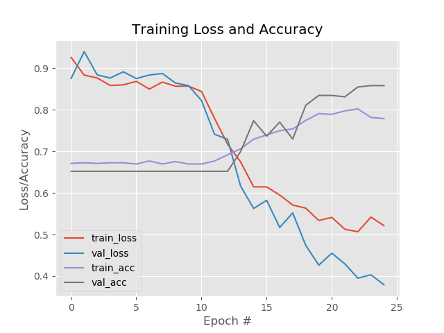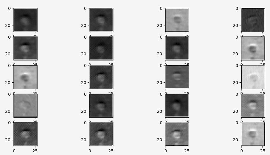 # -*- coding: utf-8 -*-# @Time : 18-7-25 下午2:33# @Author : DuanBin# @Email : [email protected]# @File : catl_train.py# @Software: PyCharm# USAGE# python catl_train.py --dataset data --model catl.model# import the necessary packagesfrom keras.preprocessing.image import ImageDataGeneratorfrom keras.optimizers import Adamfrom sklearn.model_selection import train_test_splitfrom keras.preprocessing.image import img_to_arrayfrom keras.utils import to_categoricalfrom keras.models import Modelfrom keras.models import load_modelfrom lenet import LeNetfrom imutils import pathsimport matplotlib.pyplot as pltimport numpy as npimport argparseimport randomimport cv2import os# set the matplotlib backend so figures can be saved in the backgroundimport matplotlib matplotlib.use("Agg") dataPath = "data"modelPath = "catl_5_5.model"plotPath = "catl_plot_5_5_blog.png"# initialize the number of epochs to train for, initia learning rate,# and batch sizeEPOCHS = 50INIT_LR = 0.001BS = 3classNumber = 3imageDepth = 1# initialize the data and labelsprint("[INFO] loading images...") data = [] labels = []# grab the image paths and randomly shuffle themimagePaths = sorted(list(paths.list_images(dataPath))) # args["dataset"])))random.seed(42) random.shuffle(imagePaths)# loop over the input imagesfor imagePath in imagePaths: # load the image, pre-process it, and store it in the data list image = cv2.imread(imagePath, 0) image = cv2.resize(image, (28, 28)) image = img_to_array(image) data.append(image) # extract the class label from the image path and update the # labels list label = imagePath.split(os.path.sep)[-2] if label == "dity": label = 0 elif label == "tan": label = 1 elif label == "valley": label = 2 labels.append(label)# scale the raw pixel intensities to the range [0, 1]data = np.array(data, dtype="float") / 255.0labels = np.array(labels)# partition the data into training and testing splits using 75% of# the data for training and the remaining 25% for testing(trainX, testX, trainY, testY) = train_test_split(data, labels, test_size=0.3, random_state=42)print(trainX.shape)# convert the labels from integers to vectorstrainY = to_categorical(trainY, num_classes=classNumber) testY = to_categorical(testY, num_classes=classNumber)print(trainY.shape)print(testX.shape)# construct the image generator for data augmentationaug = ImageDataGenerator(rotation_range=30, width_shift_range=0.1, height_shift_range=0.1, shear_range=0.2, zoom_range=0.2, horizontal_flip=True, fill_mode="nearest")# # initialize the modelprint("[INFO] compiling model...") model = LeNet.build(width=28, height=28, depth=imageDepth, classes=classNumber) opt = Adam(lr=INIT_LR, decay=INIT_LR / EPOCHS) model.compile(loss="categorical_crossentropy", optimizer=opt, metrics=["accuracy"]) model.summary()# train the networkprint("[INFO] training network...") H = model.fit_generator(aug.flow(trainX, trainY, batch_size=BS), validation_data=(testX, testY), steps_per_epoch=len(trainX) // BS, epochs=EPOCHS, verbose=1)# save the model to diskprint("[INFO] serializing network...") model.save(modelPath) # args["model"])model.save_weights("catl_5_5_wight.h5")# plot the training loss and accuracyplt.style.use("ggplot") plt.figure() N = EPOCHS plt.plot(np.arange(0, N), H.history["loss"], label="train_loss") plt.plot(np.arange(0, N), H.history["val_loss"], label="val_loss") plt.plot(np.arange(0, N), H.history["acc"], label="train_acc") plt.plot(np.arange(0, N), H.history["val_acc"], label="val_acc") plt.title("Training Loss and Accuracy") plt.xlabel("Epoch #") plt.ylabel("Loss/Accuracy") plt.legend(loc="lower left") plt.savefig(plotPath) # args["plot"])plt.show() layer_outputs = [layer.output for layer in model.layers] activation_model = Model(inputs=model.input, outputs=layer_outputs) activations = activation_model.predict(testX[0].reshape(1, 28, 28, 1))def display_activation(activations, col_size, row_size, act_index): activation = activations[act_index] activation_index = 0 fig, ax = plt.subplots(row_size, col_size, figsize=(row_size * 2.5, col_size * 1.5)) for row in range(0, row_size): for col in range(0, col_size): ax[row][col].imshow(activation[0, :, :, activation_index], cmap='gray') activation_index += 1 plt.show() display_activation(activations, 4, 5, 1)