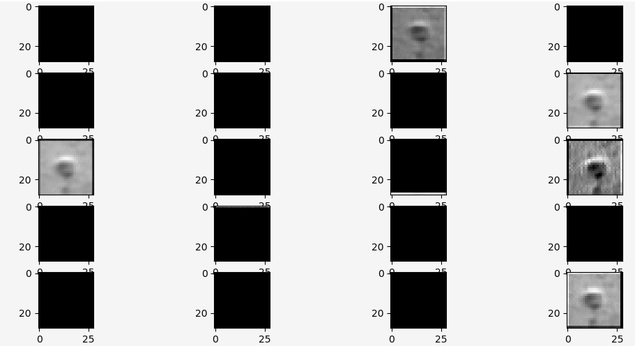 分析图3,发现经过Relu激活函数后,只留下了很明显向下凹的缺陷特征图片,但是有效的特征图片(FeatureMap)太少,只有2个。