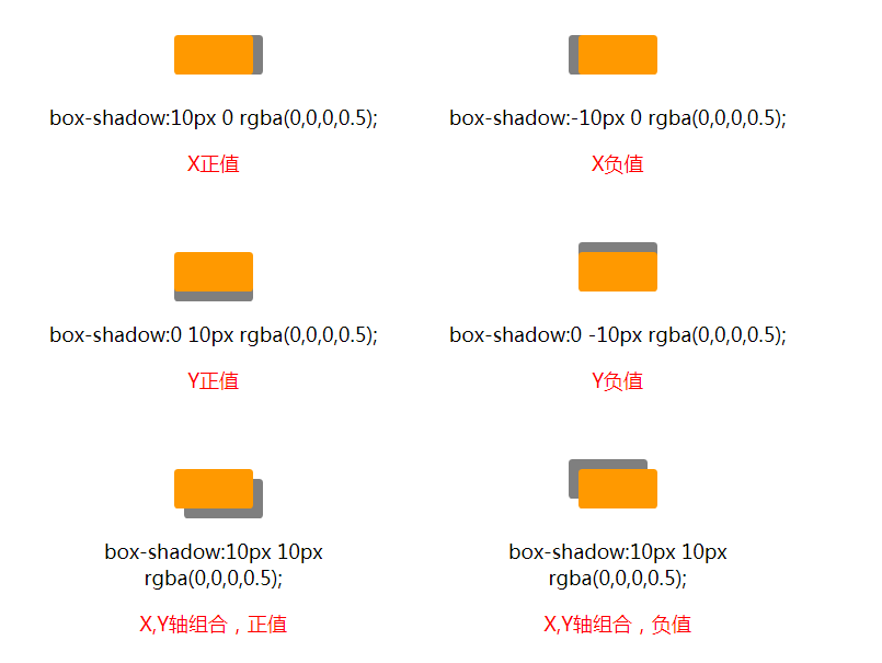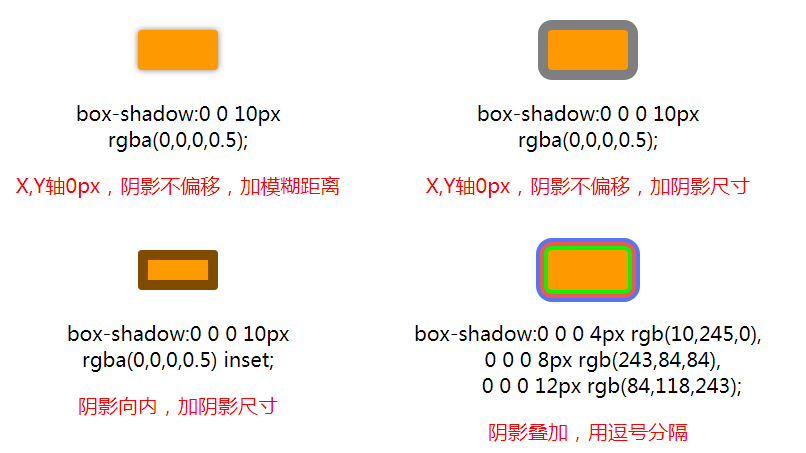 仔细看看上面这张图,通过设置不同属性值,呈现不同的阴影效果,自己手动敲一敲印象更深。