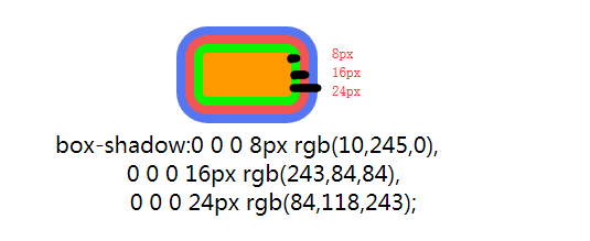 我们再看一下最后一张图的放大版,下面元素被添加了三个阴影,其中第一个阴影的半径为8px。第二个阴影半径为16px,由于有8px被前一个阴影遮盖了,所以我们只看到8px。第三个阴影半径为24px,由于前面16px被前面的阴影遮盖了,所以也是只看到8px。这就是阴影叠加啦。