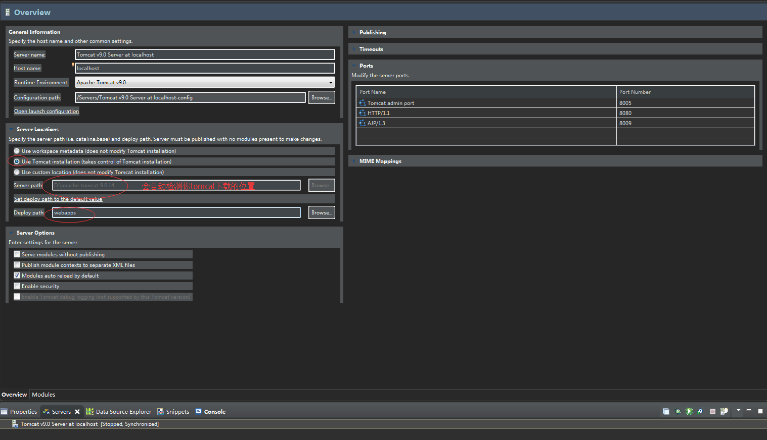 能启动服务器,但是eclipse默认运行后会部署到一个叫做wtpwebapps的文件夹,若想将默认文件夹改成Tomcat目录下的webapps(为了方便在eclipse外直接用浏览器和Tomcat发布),可以按以下步骤修改:
