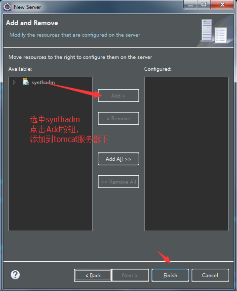 然后还是把项目通过add and remove操作添加到tomcat服务器下。添加成功之后,最后是重启一下eclipse。
