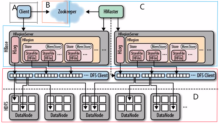 关于HBase的架构图,直接抓取网络上图片来分析就好了。它大概长成下面的样子:
