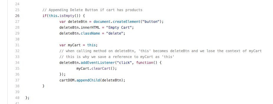 那为什么我需要使用“var myCart = this”?因为inside deleteBtn.addEventListener,这引用了deleteBtn对象。这很不幸。有更好的解决方案吗?