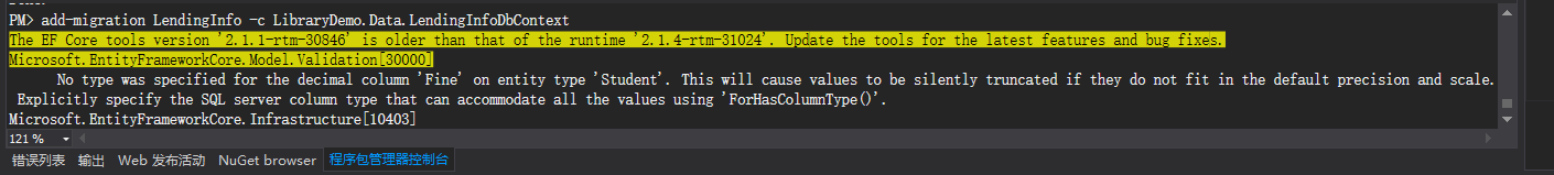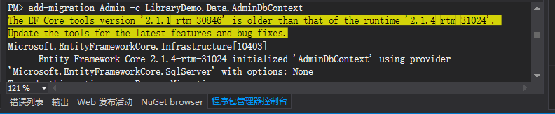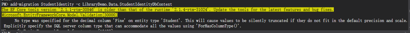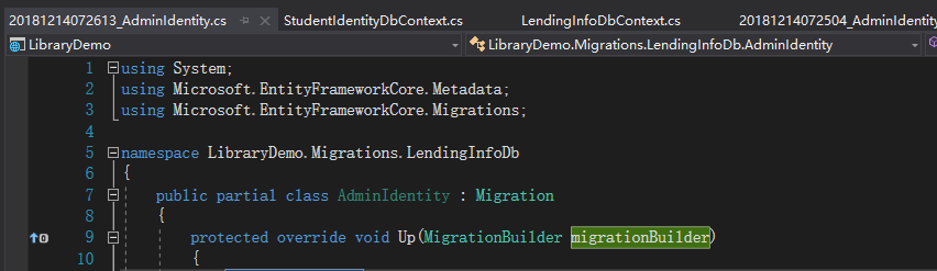 1 cd LibraryDemo 2 add-migration Admin -c LibraryDemo.Data.AdminDbContext 3 add-migration LendingInfo -c LibraryDemo.Data.LendingInfoDbContext 4 add-migration StudentIdentity -c LibraryDemo.Data.StudentIdentityDbContext
