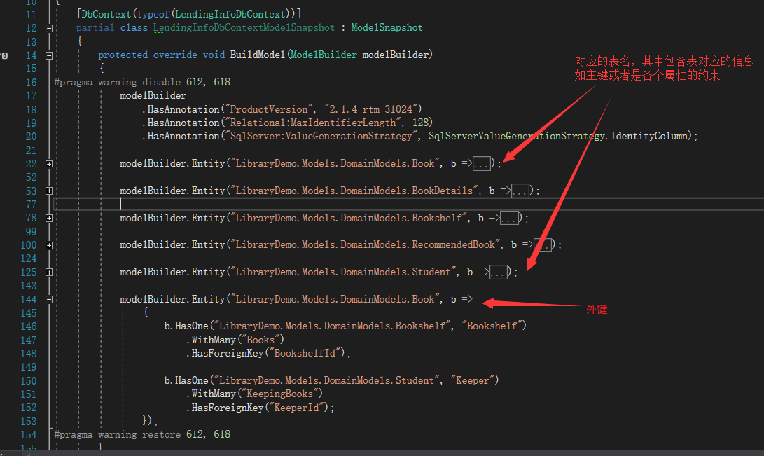 在创建迁移时,EF 会自动为我们创建或更新对应 DbContext 的快照,即其中后缀为 Snapshot 的类。其中会包含当前对应的 DbCOntext 的结构,并会以代码保留相应的约束,如 LendingInfoDbContextModelSnapshot 类: