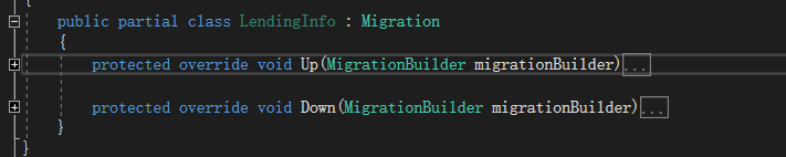 生成的迁移类 LendingInfo 和 Account 类则有两个方法—— 用于更新数据库的 Up 方法和用以回溯数据库的 Down 方法,可以在这两个方法或者在快照的 BuildModel 方法中使用 Fluent API 对数据库做进一步的改动,并且通过对 Fluent API 的使用可以使我们的类少用 DataAnnotations 以保证类的整洁。