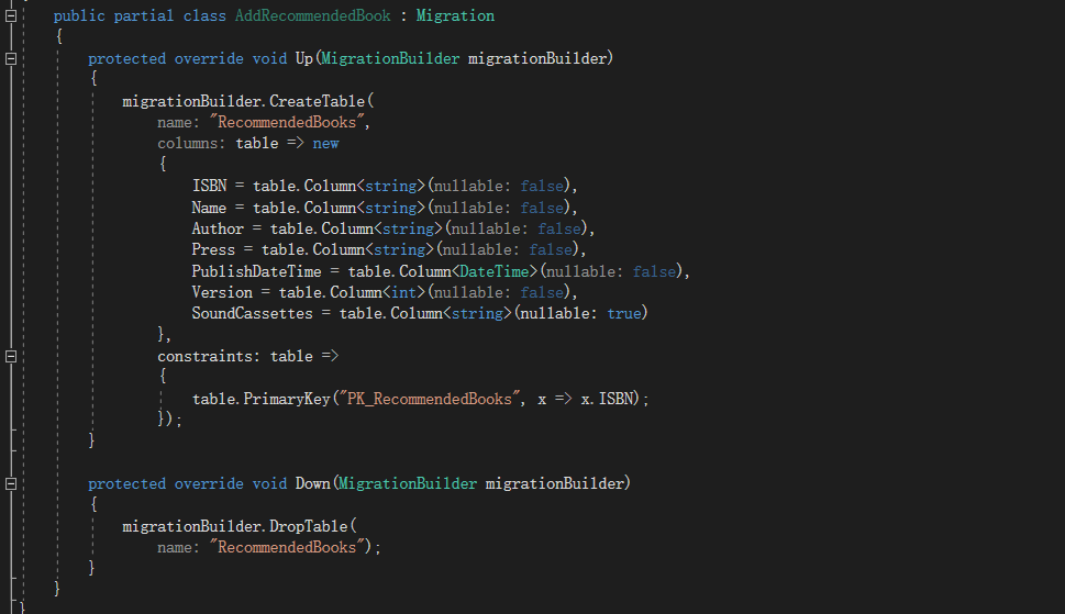 需要注意的是,生成的迁移类中的 Up 和 Down 方法是根据生成迁移之前的数据库快照生成的,如我在之后为 LendingInfoDbContext 添加 DbSet<RecommendedBook> 时,在以上的基础上运行了 add-migration AddRecommendedBook -c LibraryDemo.Data.LendingInfoDbContext ,生成的 Up 方法只包括添加表 RecommendedBooks 的行为,而 Down 方法只包括删除表 RecommendedBooks 的行为。
