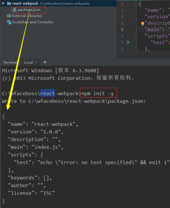 在安装webpack之前,我们先建立一个文件夹,并利用开发工具webstorm打开刚才新建的文件夹(或者新建项目,其项目目录选择刚才新建的文件夹),然后使用webstorm终端初始化webpack项目,命令如下: