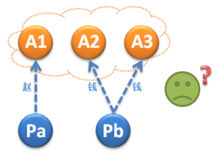 P2b是一个比P2a更强的约束,也就是说P2b是P2a的充分条件,只要能满足P2b,那P2a就自动满足。但P2b很难被满足,考虑下图这种情况,A1接受了议案“赵”,A2即将接受议案“赵”,此时Pb提出了一个议案“钱”,这种情况下我们又会遇到跟P2a完全相同的麻烦。
