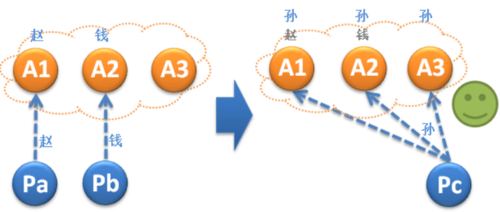 如下图所示, A1已经接受了“赵”,A2已经接受了“钱”,此时Pc提出了“孙”,并被A1,A2,A3接受,这样就解决了无法形成多数派的问题。