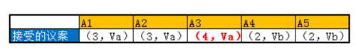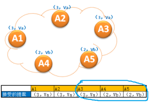 一共5个Acceptor,有3个Acceptor接受了议案(3,Va),刚刚过半。此时有一个编号为4的议案要提出,根据P2c的规则2,首先选一个过半的集合,就选上图中蓝色线圈出来的A3,A4,A5好了(任意选),这个集合中编号最大的议案是(3,Va),因此新提出的议案必定为(4,Va)。符合P2b。