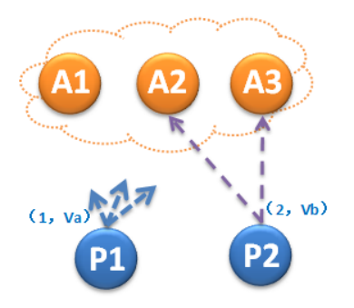 例如下图所示:有一个在途的议案(1,Va),当A2和A3对议案(2,Vb)做出承诺的同时,(1,Va)就失去了形成多数派的权利。