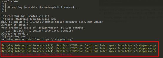 3、 重新执行msfupdate进行msf更新,程序报错,报错信息如下: