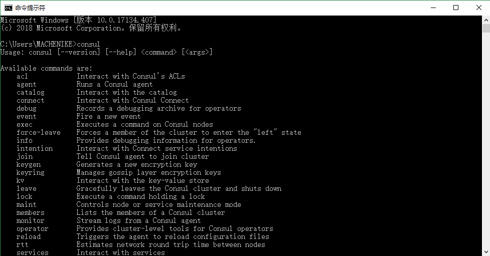 我们需要去下载Consul ,下载很简单,直接去:https://www.consul.io/downloads.html 选择对应的平台即可,如果你的是Mac OS x 那么直接双击那个可执行文件即可,我的平台是windows10 ,那么相对于MacOsX是比较困难的,即配置环境变量,将文件的位置放到你的path中就可以了,其目的就是为了在Cmd终端中能够键入执行Consul命令,如果你的环境变量已经配置成功,请在Cmd中敲击consul,如果结果如下,那么恭喜您,你成功进入Consul大门。