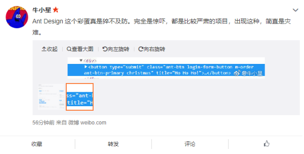 昨天,在国外民众还在欢度圣诞期间,开发者社区却对 Antd 开发团队发起了连番的炮轰。一觉醒来,他们发现由自己参与设计的、公司内网、办事系统等网页上,有一些按钮的上面多了一团白色的“积雪”,在白背景下,看着有点像是被“咬掉”了一块似的,不仅如此,将鼠标指向变化了的按钮时,原本设定好的文字说明也统一变成了“Ho ho ho”,这是“圣诞老人”标志性的笑声。