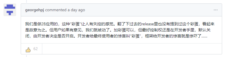 事件出现后,在代码托管网站 GitHub 和社交媒体上,开发者们及吃瓜群众表现出了一边倒批评的态度 ——“我留意到按钮组件的上方出现了一块雪花?这是圣诞节彩蛋吧?为什么不经过开发者的允许就擅自加上了?”