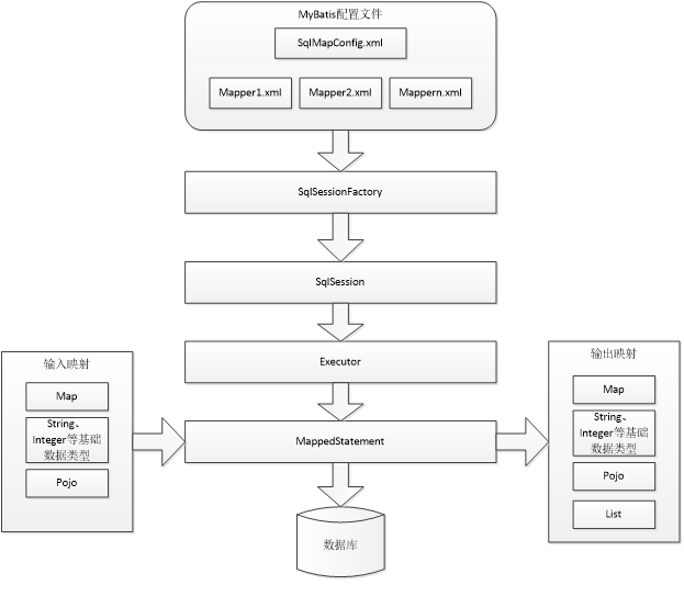 下面好好看一下 Mybatis 的系统架构图,核心配置文件是 sqlMapConfig.xml,通过 Mappers 映射器来连接主配置和各个实体类操作所用到的 SQL 语句。有了配置和 SQL 语句 ,使用 SqlSession 来执行 SQL,在执行的时候会涉及到入参和出参。