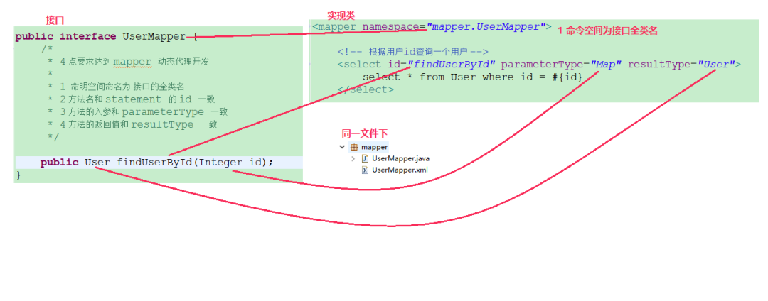 为了简化开发,Mybatis 的开发人员就想到使用 mapper 动态代理开发,其结果就是,我们只需要为 DAO 层的业务编写一个接口和 mapper 文件即可,既然把实现类给省略了,那肯定需要以某种形式体现出具体的实现在哪里。