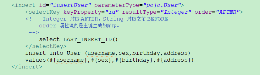配置并使用 select LAST_INSERT_ID( ) 函数即可,这里 order 为主键生成的顺序,在主键自增的时候使用 AFTER,在主键为 UUID 的时候配置为 BRFORE 。