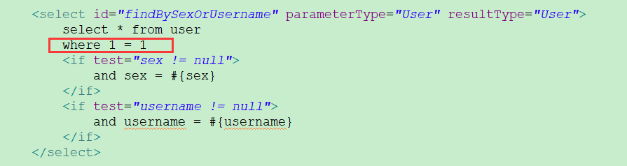 上面的 SQL 改造还是不到位,还要添加一个鸡肋的语句 1 = 1 ,怎么才能去掉这个呢,这就需要使用 where 标签了,我们只需要这样即可
