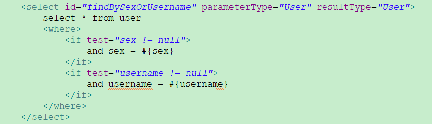 select id, username, birthday, sex, address from user where sex = #{sex} and username = #{username}