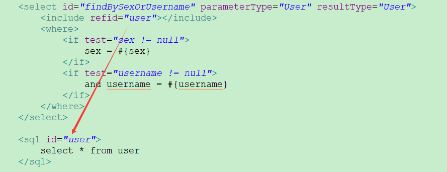 看看 SQL 你会发现,“select * from user” 经常出现,我们可以抽取出来,这样就需要用到 include 和 sql 标签。如下图