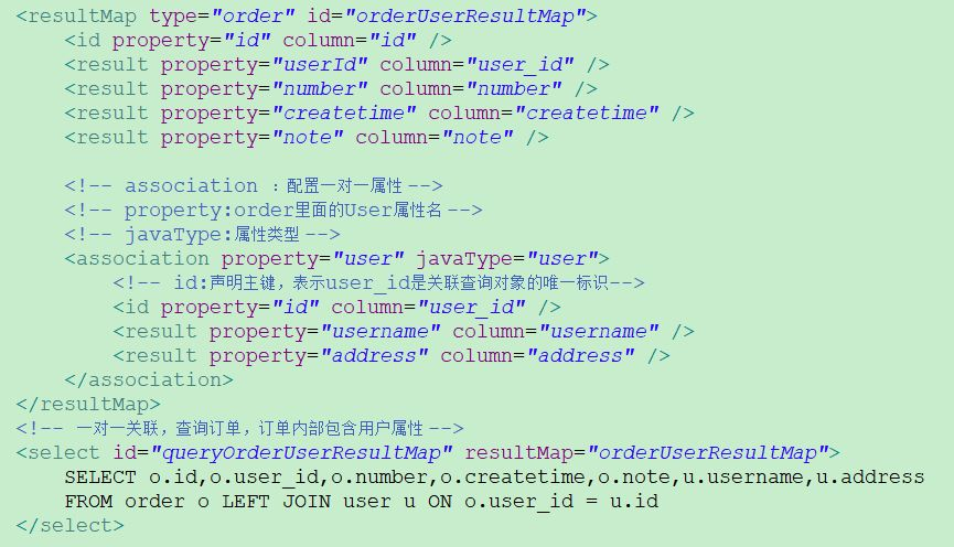 那我们如何使用 Mybatis 将 SQL 结果与对象绑定呢,这里我们必须要使用 resultMap 来重新定义结果集,在定义结果集的时候,我们需要将关联的对象一并表示出来。在一对一的关系中,我们可以使用 association 标签,具体如下图所示