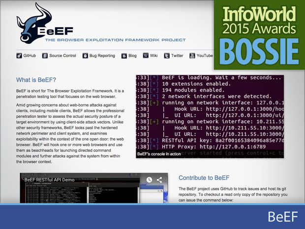 BeEF 自带键盘记录器、端口扫描器和 Web 代理这样的常用模块,此外你可以编写你自己的模块或直接将命令发送到被控制的测试机上。BeEF 带有少量的演示网页来帮你快速入门,使得编写更多的网页和攻击模块变得非常简单,让你可以因地适宜的自定义你的测试。BeEF 是一个非常有价值的评估浏览器和终端安全、学习如何发起基于浏览器攻击的测试工具。可以使用它来向你的用户综合演示,那些恶意软件通常是如何感染客户端设备的。
