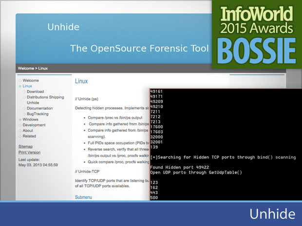 Unhide 实际上是两个单独的脚本:一个用于进程,一个用于端口。该工具查询正在运行的进程、线程和开放的端口并将这些信息与系统中注册的活动比较,报告之间的差异。Unhide 和 WinUnhide 是非常轻量级的脚本,可以运行命令行而产生文本输出。它们不算优美,但是极为有用。Unhide 也包括在 Rootkit Hunter 项目中。