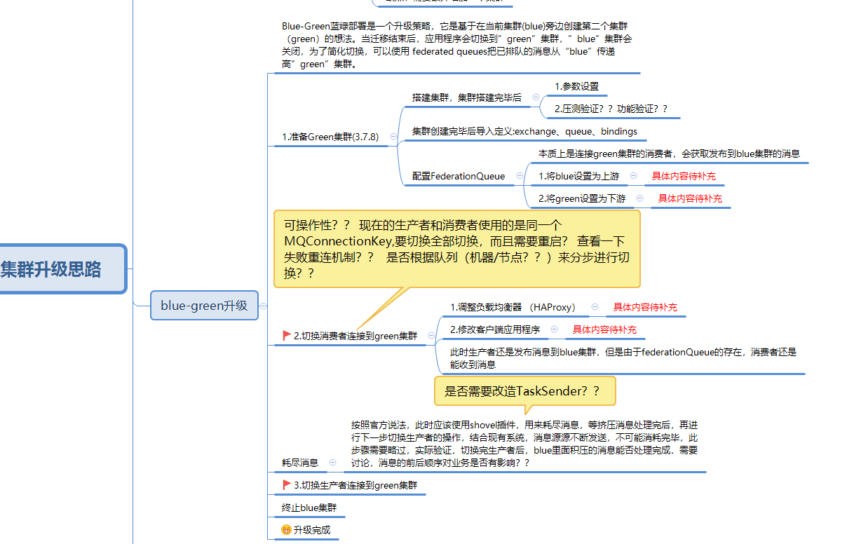 Blue-Green蓝绿部署是一个升级策略,它是基于在当前集群(blue)旁边创建第二个集群(green)的想法。当迁移结束后,应用程序会切换到”green”集群,”blue”集群会关闭,为了简化切换,可以使用 federated queues把已排队的消息从“blue”传递高”green”集群。