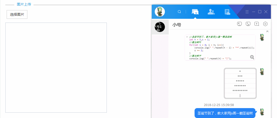 代码与之前的博客变化不大,主要是将p标签换成了img标签并且调整好样式,input加入了格式校验,使用window.URL.createObjectURL进行图片的预览等等,更多细节请直接看对比之前的代码与现在的代码