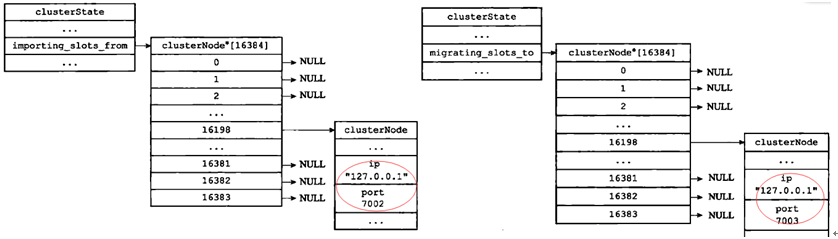 下图左边7003目标节点 importing_slots_from数组 和 右边7002源节点的migrating_slots_to数组: