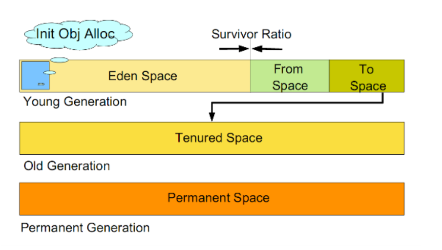 所有新生成的对象首先都是放在年轻代的。年轻代的目标就是尽可能快速的收集掉那些生命周期短的对象。年轻代分三个区。一个Eden区,两个Survivor区(一般而言)。大部分对象在Eden区中生成。当Eden区满时,还存活的对象将被复制到Survivor区(两个的一个),当这个Survivor区满时,此区的存活对象将被复制到另外一个Survivor区,当这个Survivor去也满了的时候,从第一Survivor区复制过来的并且此时还存活的对象,将被复制“年老区(Tenured)”。需要注意,Survivor的两个区是对称的,没先后系,所以同一个区中可能同时存在从Eden复制过来 对象,和从前一个Survivor复制过来的对象,而复制到年老区的只有从第一个Survivor去过来的对象。而且,Survivor区总有一个是空的。同时,根据程序需要,Survivor区是可以配置为多个的(多于两个),这样可以增加对象在年轻代中的存在时间,减少被放到年老代的可能。