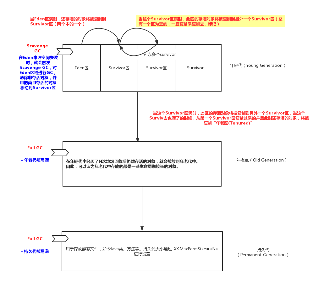 一般情况下,当新对象生成,并且在Eden申请空间失败时,就会触发Scavenge GC,对Eden区域进行GC,清除非存活对象,并且把尚且存活的对象移动到Survivor区。然后整理Survivor的两个区。这种方式的GC是对年轻代的Eden区进行,不会影响到年老代因为大部分对象都是从Eden区开始的,同时Eden区不会分配的很大,所以Eden区的GC会频繁进行。因而,一般在这里需要使用速度快、效率高的算法,使Eden去能尽快空闲出来。