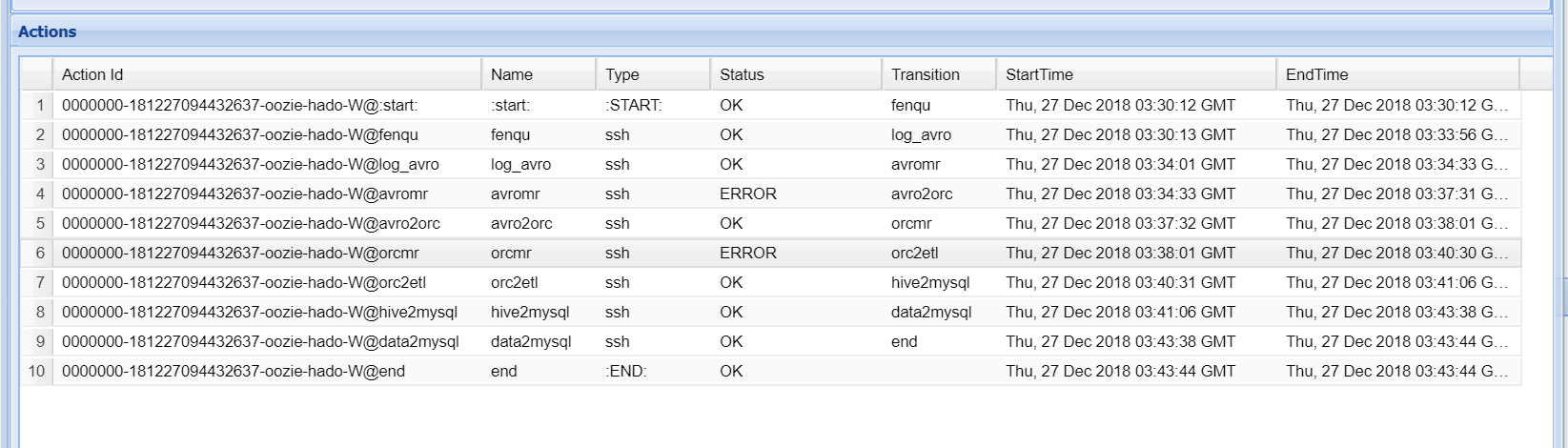 workflow.xml<workflow-app xmlns="uri:oozie:workflow:0.2" name="ssh-wf"> <start to="fenqu"/> <action name="fenqu"> <ssh xmlns="uri:oozie:ssh-action:0.1"> <host>[email protected]</host> <command>/home/hadoop/etl/fenqu.sh</command> <!--<args>"Hello Oozie!"</args>--> </ssh> <ok to="log_avro"/> <error to="fail"/> </action> <action name="log_avro"> <ssh xmlns="uri:oozie:ssh-action:0.1"> <host>[email protected]</host> <command>/home/hadoop/etl/log_avro.sh</command> <!--<args>"Hello Oozie!"</args>--> </ssh> <ok to="avromr"/> <error to="fail"/> </action> <action name="avromr"> <ssh xmlns="uri:oozie:ssh-action:0.1"> <host>[email protected]</host> <command>/home/hadoop/etl/avromr.sh</command> <!--<args>"Hello Oozie!"</args>--> </ssh> <ok to="fail"/> <error to="avro2orc"/> </action> <action name="avro2orc"> <ssh xmlns="uri:oozie:ssh-action:0.1"> <host>[email protected]</host> <command>/home/hadoop/etl/avro2orc.sh</command> <!--<args>"Hello Oozie!"</args>--> </ssh> <ok to="orcmr"/> <error to="fail"/> </action> <action name="orcmr"> <ssh xmlns="uri:oozie:ssh-action:0.1"> <host>[email protected]</host> <command>/home/hadoop/etl/orcmr.sh</command> <!--<args>"Hello Oozie!"</args>--> </ssh> <ok to="fail"/> <error to="orc2etl"/> </action> <action name="orc2etl"> <ssh xmlns="uri:oozie:ssh-action:0.1"> <host>[email protected]</host> <command>/home/hadoop/etl/orc2etl.sh</command> <!--<args>"Hello Oozie!"</args>--> </ssh> <ok to="hive2mysql"/> <error to="fail"/> </action> <action name="orc2etl2"> <ssh xmlns="uri:oozie:ssh-action:0.1"> <host>[email protected]</host> <command>/home/hadoop/etl/orc2etl.sh</command> <!--<args>"Hello Oozie!"</args>--> </ssh> <ok to="hive2mysql"/> <error to="fail"/> </action> <action name="hive2mysql"> <ssh xmlns="uri:oozie:ssh-action:0.1"> <host>[email protected]</host> <command>/home/hadoop/etl/hive2mysql.sh</command> <!--<args>"Hello Oozie!"</args>--> </ssh> <ok to="data2mysql"/> <error to="fail"/> </action> <action name="data2mysql"> <ssh xmlns="uri:oozie:ssh-action:0.1"> <host>[email protected]</host> <command>/home/hadoop/etl/data2mysql.sh</command> <!--<args>"Hello Oozie!"</args>--> </ssh> <ok to="end"/> <error to="fail"/> </action> <kill name="fail"> <message>SSH action failed, error message[${wf:errorMessage(wf:lastErrorNode())}]</message> </kill> <end name="end"/></workflow-app>